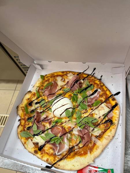 Tomate, Jambon cru, Burrata, Roquette, Parmesan réduction au vinaigre balsamique